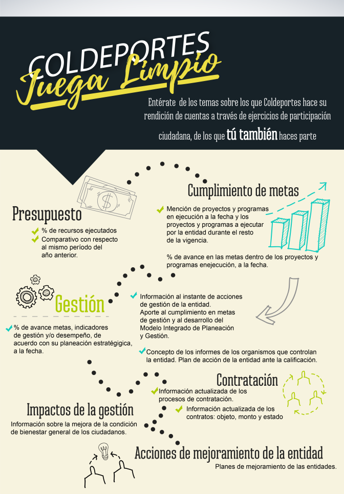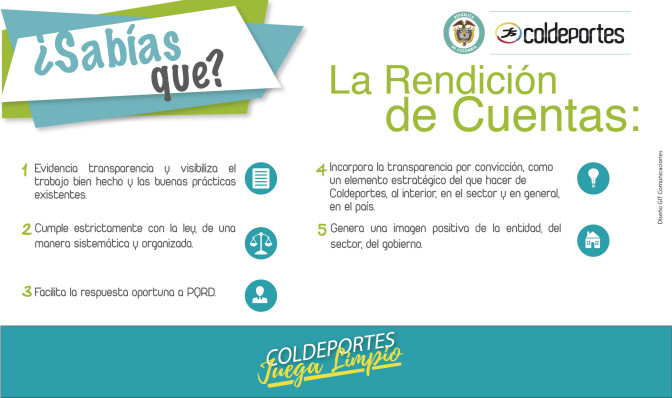 En cumplimiento a la Política de Rendición de Cuentas a los ciudadanos y grupos de interés, Coldeportes ha definido las acciones que a continuación se enumeran, orientadas a la realización de la Audiencia de Rendición de Cuentas de la entidad para la vigencia 2017.