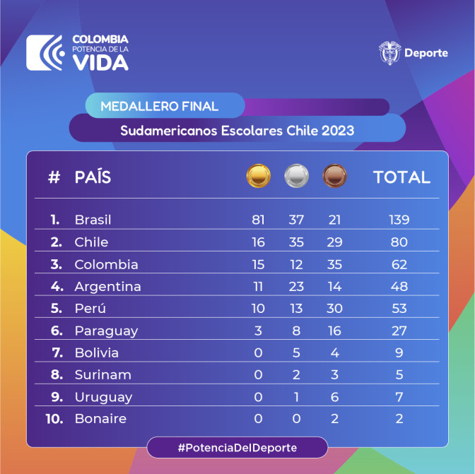 Medallero XXVII Juegos Escolares Sudamericanos Chile 2023Colombia:Oro: 15, Plata:12, Bronce: 35, Total: 62Medallero GeneralMedallero XXVII Juegos Escolares Sudamericanos Chile 2023País