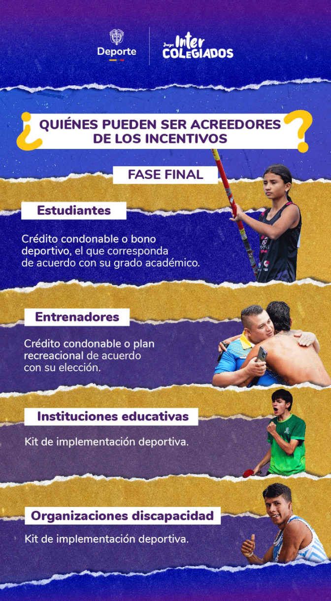 Los incentivos son un reconocimiento institucional que se otorga a los estudiantes deportistas, docentes y entrenadores, instituciones educativas públicas y privadas y organizaciones legalmente constituidas, cuyo objeto sea atender personas con discapacidad. Se les concede a quienes obtengan medallas doradas en la Final Nacional de la herramienta de transformación social, Juegos Intercolegiados Nacionales.Acreedores de los incentivos