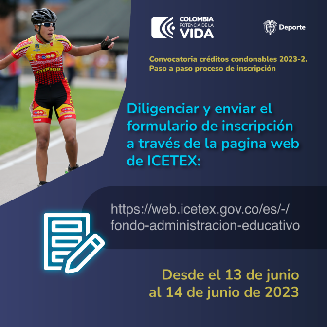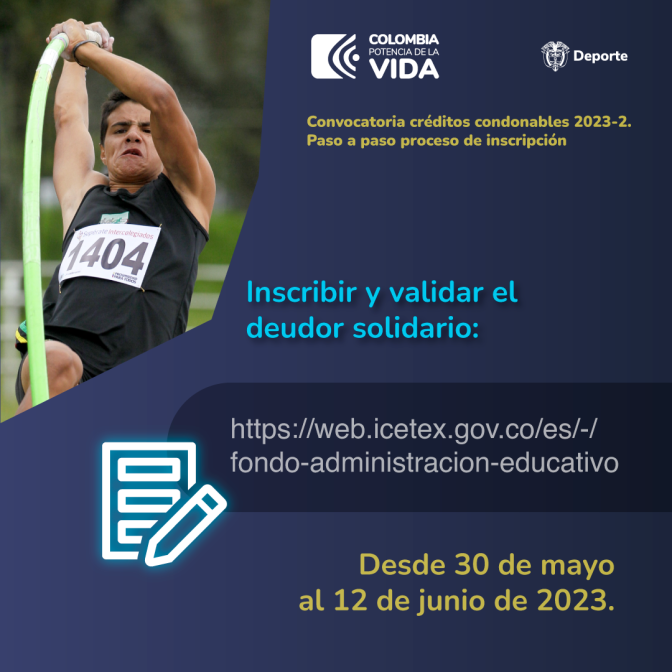 Enviar al Ministerio del Deporte al correo: contacto@mindeporte.gov.co, la siguiente documentación para surtir el proceso de verificación de requisitos:A. Acta de gradoB. Diploma de gradoC. Carta de solicitud del crédito, dirigida al Ministerio del DeporteD. Copia del documento de identidadDesde el 30 de mayo al 25 de junio de 2023.Inscribir y validar el deudor solidario: Desde 30 de mayo al 12 de junio de 2023.Formulario deudor solidarioDiligenciar y enviar el formulario de inscripción a través de la pagina web de ICETEX: Desde el 13 de junio al 14 de junio de 2023Formulario de solicitud- -