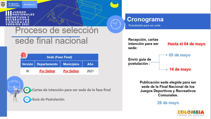 Seguimos avanzando en acciones en pro del desarrollo de los Juegos Nacionales Deportivos y Recreativos comunales 2021 y de acuerdo a lo socializado en la reunión realizada el día 27 de abril de 2021 el cronograma para el proceso de selección de la Sede Final Nacional es el siguiente: