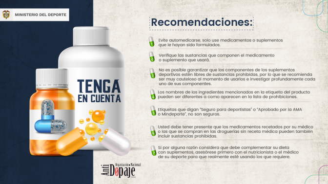 Tenga en cuenta las siguientes recomendaciones:1. Evite automedicarse, solo use medicamentos o suplementos que le hayan sido formulados.2. Verifique las sustancias que componen el medicamento o suplemento que usará.3. No es posible garantizar que los componentes de los suplementos deportivos estén libres de sustancias prohibidas, por lo que se recomienda ser muy cauteloso al momento de usarlos e investigar profundamente cada uno de sus componentes.4. Los nombres de los ingredientes mencionados en la etiqueta del producto pueden ser diferentes a como aparecen en la lista de prohibiciones.5. Etiquetas que digan "Seguro para deportistas" o "Aprobado por la AMA o Mindeporte", no son seguros.6. Usted debe tener presente que los medicamentos recetados por su médico o las que se compran en las droguerías sin receta médica pueden también incluir sustancias prohibidas.7. Si por alguna razón considera que debe complementar su dieta con suplementos, asesórese primero con el nutricionista o el médico de su deporte para que realmente esté usando los que requiere.Si por prescripción debe usar suplemento, tenga en cuenta las siguientes recomendaciones1. En caso de ser necesario un complemento de proteína, este debe ser consumido, según los cálculos de su peso corporal y cargas de entrenamiento. Consúmalo solo bajo la prescripción de su nutricionista o médico del deporte.2. Nunca se auto formule, ni compre suplementos sin asesoría o supervisión de un profesional experto en nutrición para el deporte.Para la escogencia y consumo de los suplementos y ayudas nutricionales tenga en cuenta: Suplementos dietéticos o nutricionalesLas compañías que fabrican estos suplementos no están apropiadamente reguladas. Esto quiere decir que nunca se estará seguro de lo que está tomando. Un suplemento completamente natural podría contener una sustancia prohibida y esta no podría aparecer específica en la lista de contenidos.Es peligrosoConsumir suplementos de proteínas de marca o procedencia desconocida, con empaque abierto o no seguro. Estos pueden ser reenvasados adicionando sustancias prohibidas o falsificados empacando productos con ingredientes no seguros (dopaje) en un empaque original de un producto limpio y conocido. Igualmente es peligrosoConsumir suplementos de preparación artesanal o casera, por recomendación familiar, de amigos o deportistas, pero de ingredientes o contenido nutricional desconocido. Tabletas, jarabes, fórmulas en polvo, plantas o yerbas aromáticas, sin nombre, registro, etiqueta, empaque abierto o procedencia desconocida.