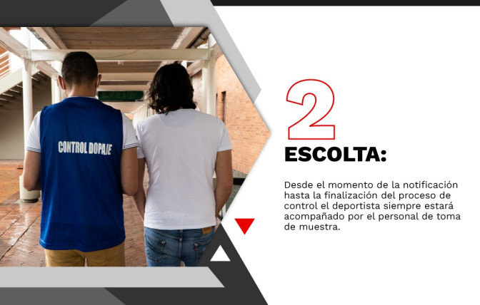 2. ESCOLTA: Desde el momento de la notificación hasta la finalización del proceso de control el deportista siempre estará acompañado por el personal de toma de muestra.