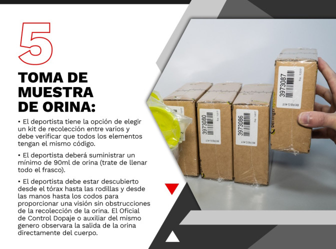 5. TOMA DE MUESTRA DE ORINA:- El deportista tiene la opción de elegir in kit de recolección entre varios y debe verificar que todos los elementos tengan el mismo código.