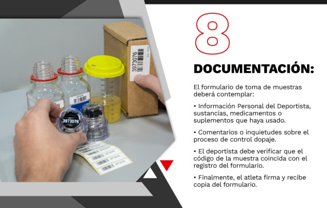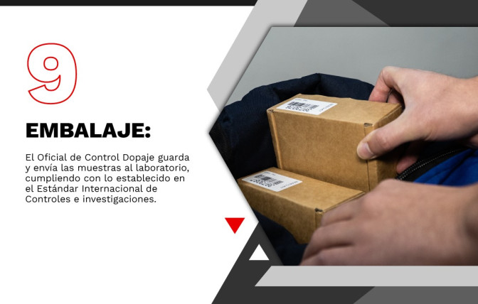 9. EMBALAJE: El Oficial de Control Dopaje guarda y envía las muestras al laboratorio, cumpliendo con lo establecido en el Estándar Internacional de Controles e investigaciones.
