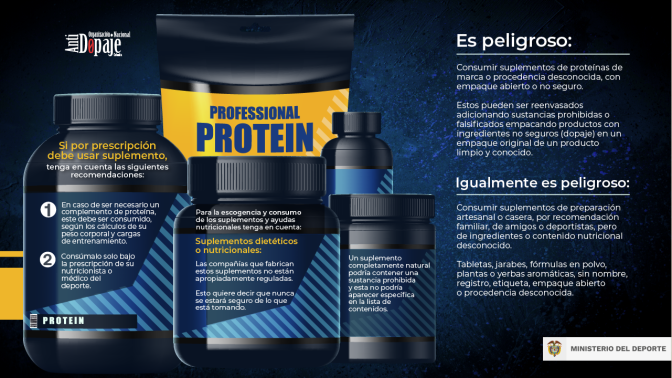 Tenga en cuenta las siguientes recomendaciones:1. Evite automedicarse, solo use medicamentos o suplementos que le hayan sido formulados.2. Verifique las sustancias que componen el medicamento o suplemento que usará.3. No es posible garantizar que los componentes de los suplementos deportivos estén libres de sustancias prohibidas, por lo que se recomienda ser muy cauteloso al momento de usarlos e investigar profundamente cada uno de sus componentes.4. Los nombres de los ingredientes mencionados en la etiqueta del producto pueden ser diferentes a como aparecen en la lista de prohibiciones.5. Etiquetas que digan "Seguro para deportistas" o "Aprobado por la AMA o Mindeporte", no son seguros.6. Usted debe tener presente que los medicamentos recetados por su médico o las que se compran en las droguerías sin receta médica pueden también incluir sustancias prohibidas.7. Si por alguna razón considera que debe complementar su dieta con suplementos, asesórese primero con el nutricionista o el médico de su deporte para que realmente esté usando los que requiere.Si por prescripción debe usar suplemento, tenga en cuenta las siguientes recomendaciones1. En caso de ser necesario un complemento de proteína, este debe ser consumido, según los cálculos de su peso corporal y cargas de entrenamiento. Consúmalo solo bajo la prescripción de su nutricionista o médico del deporte.2. Nunca se auto formule, ni compre suplementos sin asesoría o supervisión de un profesional experto en nutrición para el deporte.Para la escogencia y consumo de los suplementos y ayudas nutricionales tenga en cuenta: Suplementos dietéticos o nutricionalesLas compañías que fabrican estos suplementos no están apropiadamente reguladas. Esto quiere decir que nunca se estará seguro de lo que está tomando. Un suplemento completamente natural podría contener una sustancia prohibida y esta no podría aparecer específica en la lista de contenidos.Es peligrosoConsumir suplementos de proteínas de marca o procedencia desconocida, con empaque abierto o no seguro. Estos pueden ser reenvasados adicionando sustancias prohibidas o falsificados empacando productos con ingredientes no seguros (dopaje) en un empaque original de un producto limpio y conocido. Igualmente es peligrosoConsumir suplementos de preparación artesanal o casera, por recomendación familiar, de amigos o deportistas, pero de ingredientes o contenido nutricional desconocido. Tabletas, jarabes, fórmulas en polvo, plantas o yerbas aromáticas, sin nombre, registro, etiqueta, empaque abierto o procedencia desconocida.