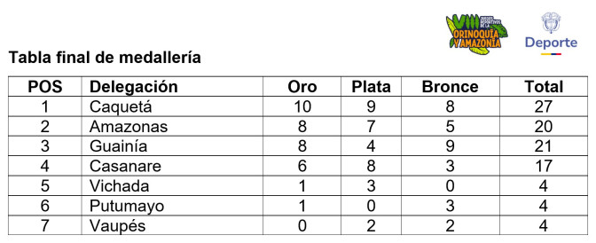 Amazonas ganó en el tiro con cerbatana, en el baloncesto y el fútbol de salón masculino, para ubicarse segundo en el medallero. Caquetá se coronó campeón tras acumular un total de 10 medallas de oro.