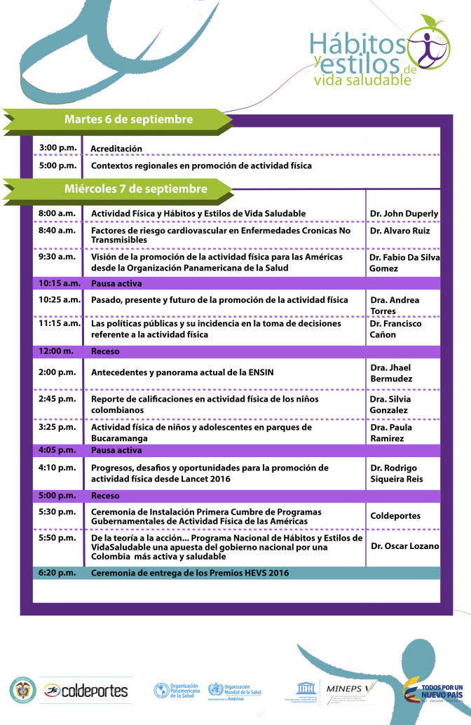 En consonancia y con el propósito de brindar herramientas para la implementación y evaluación de intervenciones en promoción de actividad física en las Américas y basados en acciones de política pública que faciliten la adopción de comportamientos saludables, desde la Dirección de Fomento y Desarrollo de Coldeportes se organizará la Primera Cumbre de Programas Gubernamentales de Actividad Física de las Américas, con el apoyo de la Organización Panamericana de la Salud (OPS) y la Organización de las Naciones Unidas para la Educación, la Ciencia y la Cultura (UNESCO), evento que tendrá lugar en Bogotá del 6 al 8 de septiembre de este año.