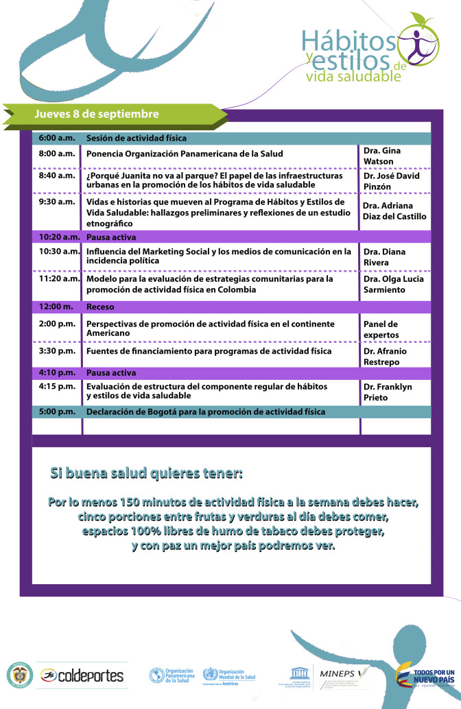 "Buscamos generar espacios donde se puedan mirar intervenciones que sirvan para mitigar el impacto de la inactividad física. Para ello contaremos con una agenda programada con componentes relacionados con epidemiología, beneficios de la actividad física, elementos de política pública, ambientes urbanos, influencia del marketing social, adopción de comportamientos saludables, entre otras temáticas de gran relevancia", explicó Nubia Ruiz, profesional especializado del Grupo Interno de Trabajo de Actividad Física de Coldeportes. (Escuchar audio)