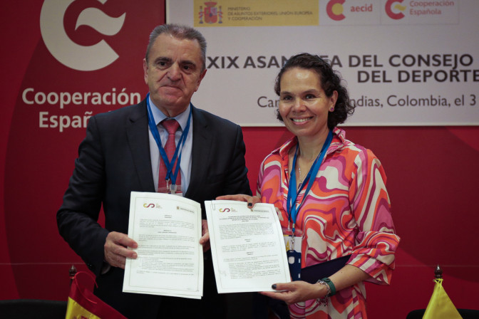 El primero de ellos, corresponde al calendario de cooperación deportiva con el Consejo Superior de Deportes del Reino de España, a fin de promover y fortalecer las relaciones de colaboración en materia de deporte y cultura física entre ambos países. Entre las acciones más destacadas en la ruta de trabajo conjunto están: el intercambio de visitas de delegaciones, entrenadores, expertos y especialistas en el campo de los deportes, la educación física, la recreación, actividad física; el intercambio de información y experiencias; el intercambio de propuestas para organizar competiciones deportivas conjuntas promoviendo las alianzas público-privadas; y la gestión de proyectos en coordinación con agencias de cooperación internacionales.