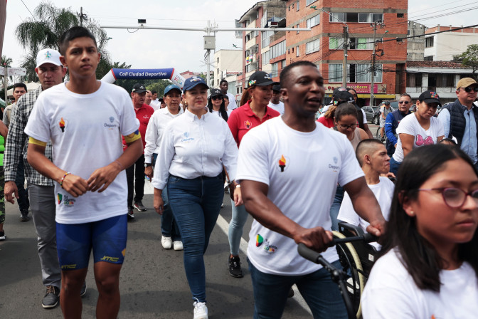 Ellos reafirmaron el compromiso de trabajar unidos por un objetivo común: el éxito de los primeros Juegos Nacionales Juveniles, una edición histórica que reunirá a atletas y para atletas de 32 departamentos, Bogotá y la Federación Deportiva Militar en 34 deportes olímpicos y 12 paralímpicos.Tras encenderse en la Laguna Negra del Parque Nacional Natural de Los Nevados, el Fuego Deportivo llegó a Cali, donde recorrió 1,400 metros desde la Villa Deportiva hasta las Piscinas Hernando Botero. En cinco relevos, atletas y Para atletas vallecaucanos llevaron con orgullo la llama que simboliza la pasión y el espíritu de los Juegos.Este trayecto fue engalanado por Juan Sebastián Scarpetta (puesto 20 del mundo en lanzamiento de martillo), Nicoll Torres, Mariana Guerrero (campeona panamericana de Para natación en Santiago 2023), Leidy y Edilson Chica (medallistas de oro en Boccia en Paris 2024) y Santiago Vásquez (campeón mundial juvenil de patinaje de carreras). Estos atletas avanzaron ante una multitud que celebraba en la ciclovía dominical de Cali. Además, también estuvieron los pesistas Diego Salazar y Óscar Figueroa.